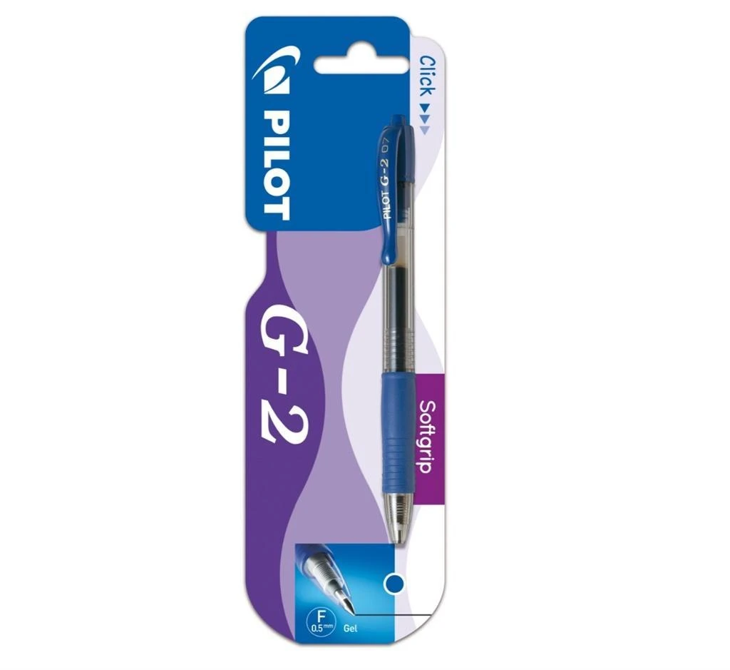 Niebieski długopis żelowy G2 na blistrze, o rozmiarze końcówki piszącej