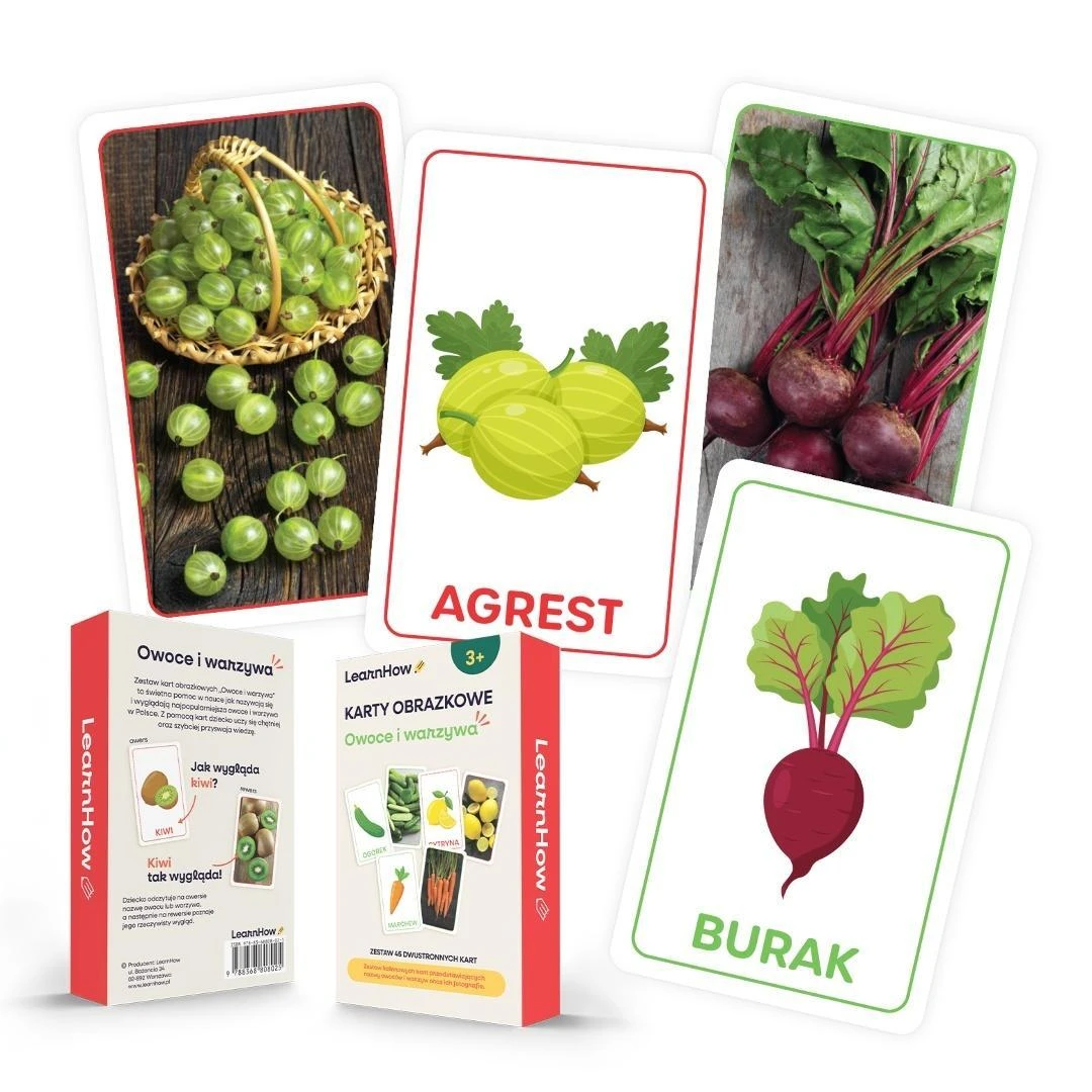Kolorowe obrazki na pewno zachęcą dziecko do obserwacji i nauki - w zestawie są 23 karty z warzywami oraz 22 karty z owocami.