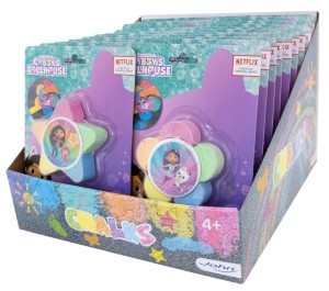 Kreda licencyjna Koci domek Gabi, kredowe koło , 2 rodzaje n5 kolorowych kred umieszczonych na kółku na licencji Koci domek Gabi, na blistrze, 24 szt w displayu, 4l+