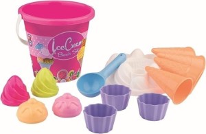 14 elementów: wiaderko, 3 babeczki, 4 rożki do lodów, 2 foremki - kremowe nadzienie babeczek, 2 foremki - lody, łyżka, stojak na lody - pokrywa wiaderka