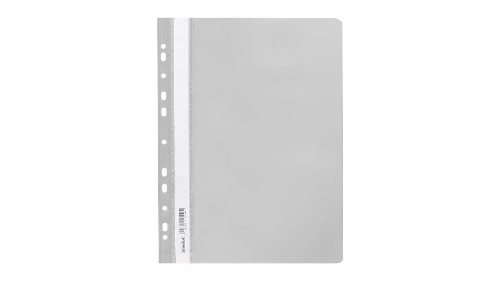 Skoroszyt wykonany z polipropylenu, miękki, przód przezroczysty, tył kolorowy. Europerforacja umożliwiająca wpięcie do segregatora z dowolnym ringiem. Wewnątrz klasyczny mechanizm z wąsem i listwą skutecznie zabezpieczający wpiętą zawartość; wąs o długości 14,5 cm. Na bocznej krawędzi wymienny, papierowy pasek do opisu zawartości z kodem kreskowym na szt. Dwa wycięcia ułatwiające wysuwanie paska. Zaokrąglone rogi obu okładek.