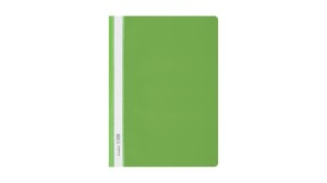 Skoroszyt wykonany z twardej folii PVC, przód przezroczysty, tył kolorowy. Wewnątrz klasyczny mechanizm z wąsem i listwą skutecznie zabezpieczający wpiętą zawartość; wąs o długości 16,5 cm. Na bocznej krawędzi wymienny, papierowy pasek do opisu zawartości z kodem kreskowym na szt. Dwa wycięcia...