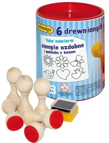 Zestaw 6 drewnianych stempelków do ozdabiania papeterii, dekorowania prezentów, tworzenia swoich kompozycji, kolorowania. W pudełku, oprócz stempli znajduje się poduszka z tuszem. Kreatywna zabawa dla najmłodszych!
