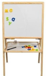Magnetyczna dwustronna tablica drewniana z liczydłem, rozkładana, duża i bogato wyposażona. Zawiera liczydło, zawierające 10 różnokolorowych kostek oraz zegar (ruchome wskazówki). Gąbka, kreda, marker, literki magnetyczne w zestawie.