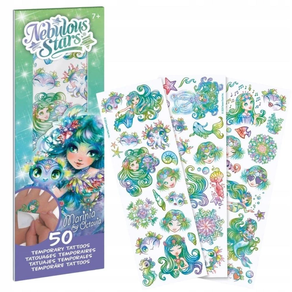 Zanurz się w podwodnym świecie Nebulous Stars razem z Marinią i jej niezwykłą towarzyszką ośmiornicą Octavią! Ten wyjątkowy zestaw 50 tatuaży przenosi dzieci do świata błękitnych fal, magicznych stworzeń i morskich przygód. Idealny dla małych artystek, które kochają fantazję i chcą ozdobić swoje ciało oryginalnymi, zmywalnymi wzorami.