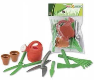 Zestaw zabawek Mały Ogrodnik zawiera osiem elementów - zabawkowych replik "dorosłych" narzędzi ogrodniczych. Są to: ruchomy sekator, ruchome nożyce, grabki, graczka, przyrząd do robienia dołków, dwie doniczki i konewka. Kolorystyka kompletu utrzymana jest w barwach...